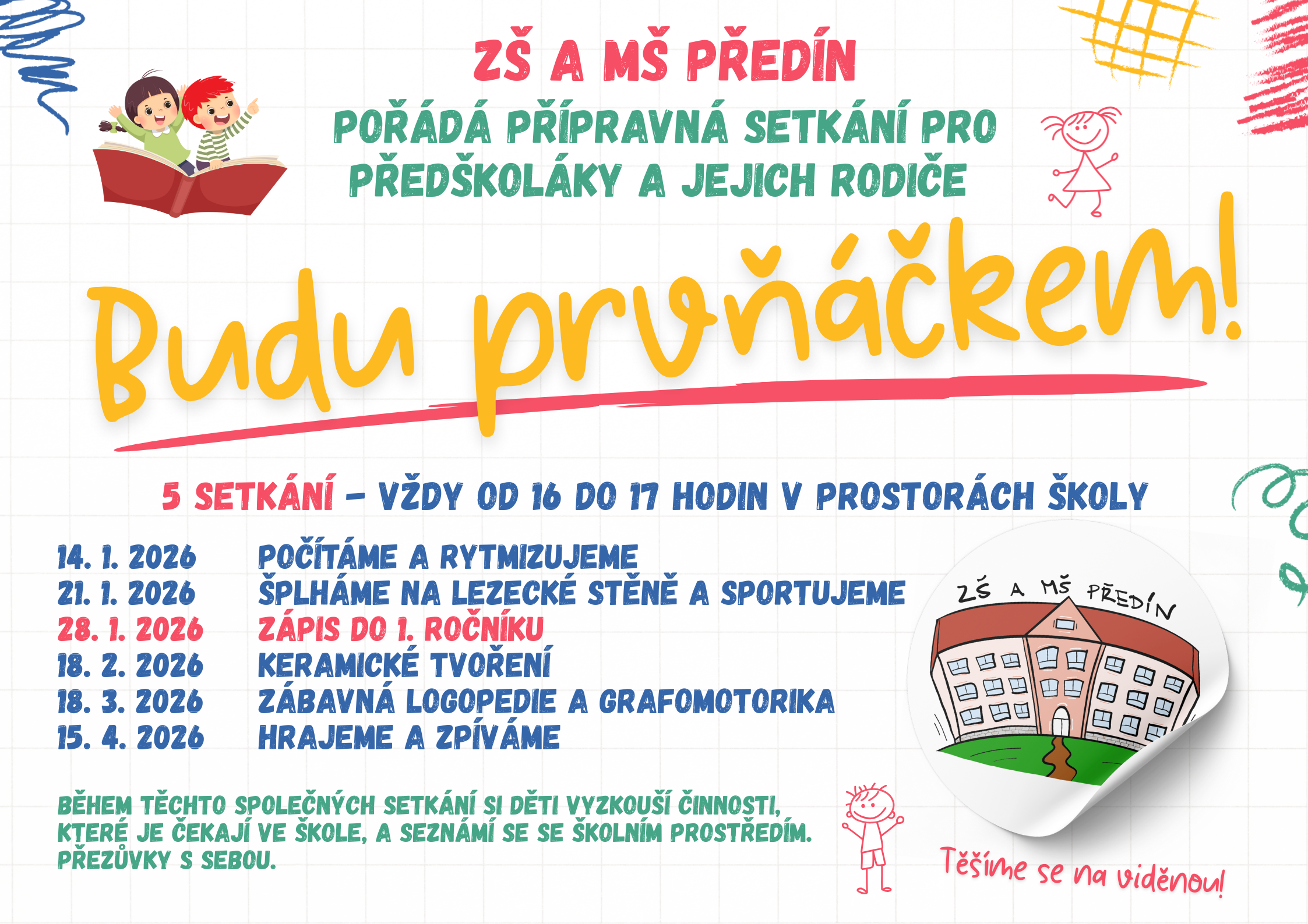 Máte doma předškoláka? ZŠ a MŠ Předín pořádá od 14. ledna 2026 přípravná setkání pro předškoláky a jejich rodiče. Během pěti plánovaných setkání si děti vyzkouší činnosti, které je ve škole čekají, seznámí se s učiteli a s prostředím školy.